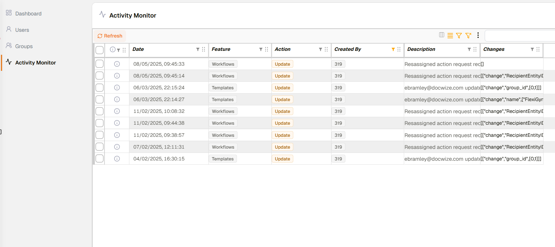 | Feature | Indicates the feature in Docwize the activity impacted. |