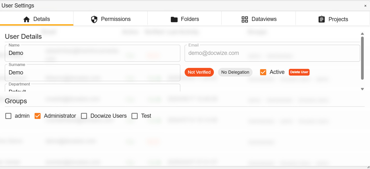 | Delete User | Indicates when last the user was active on the database. An active user has received an invite to access Docwize and is a billable user. |