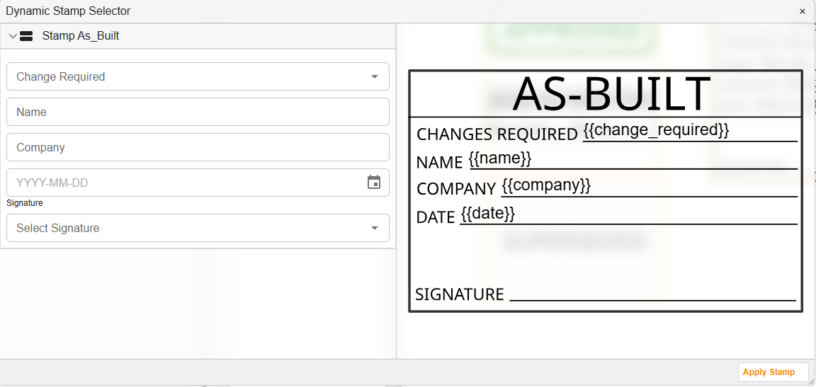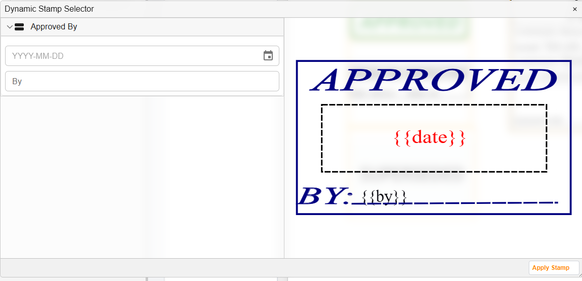 Docwize enables users to create dynamic stamps that include Jinja templates. These stamps can be applied to documents, such as during a drawing review and approval process. The stamp templates are SVG files that include Jinja text fields which can be populated by users, such as initials, signatures or a date. (Click here for more general information on stamps in Docwize.)