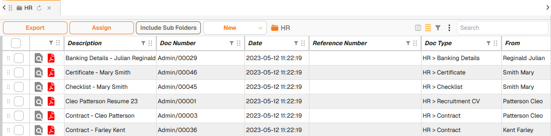 Each row in the grid will display information pertaining to the document. Some of these are standard for all documents. Some fields are customised and/or only relevant to Search results.