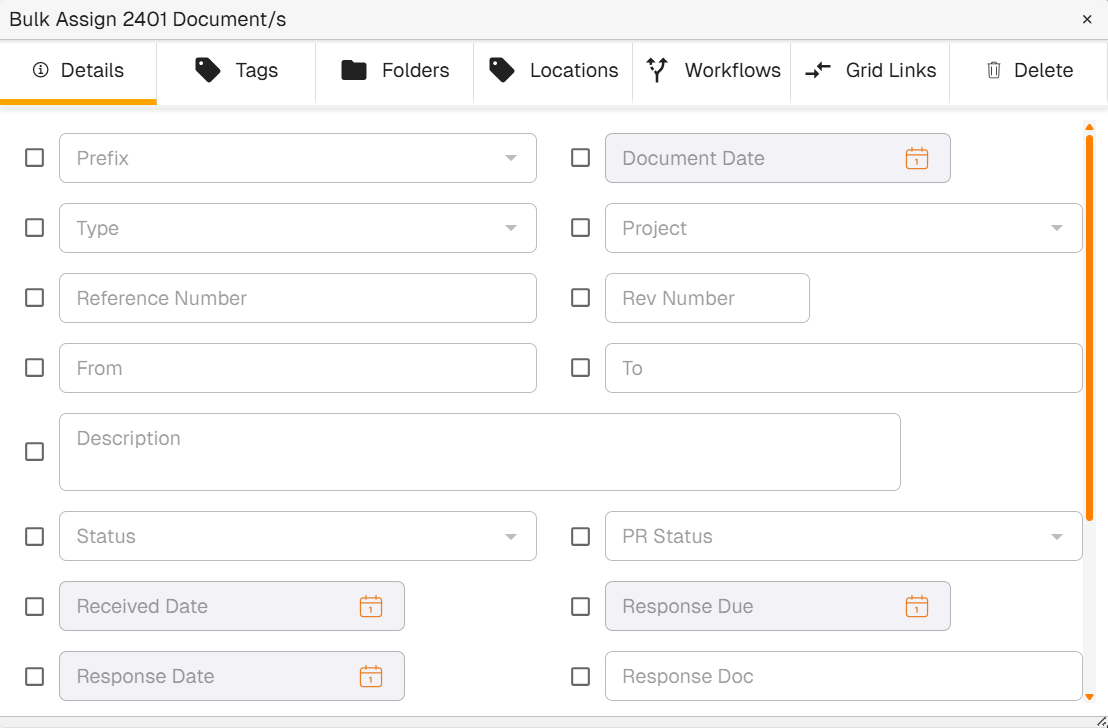 | 3 | From the horizontal toolbar in the pop-up dialog, select what you want to assign the document(s) to (Document Details, Tags, Folders, Workflows) and complete the relevant content in the dialog. |