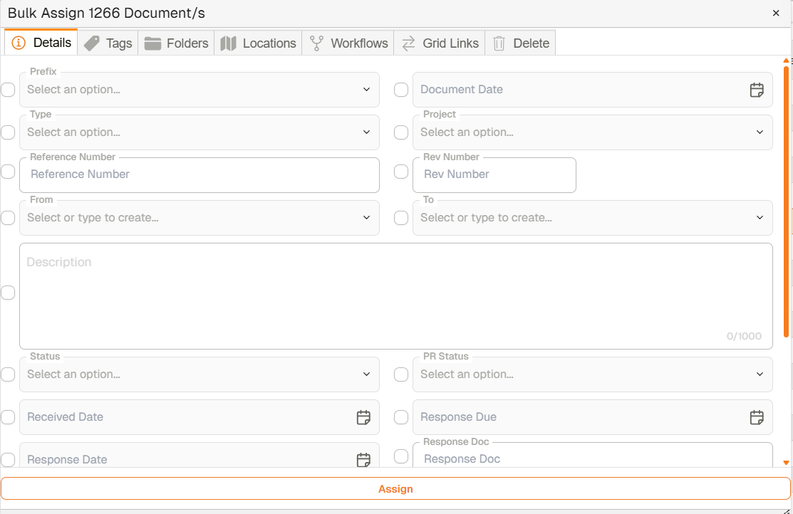 When users navigate to the ‘Assign’ dialog, they can assign documents in various ways, such as to particular metadata fields, Folders, Workflows, Tags, Gridlinks, Locations, etc. This is particularly useful for bulk-assigning documents.