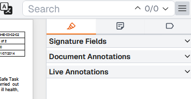| “Signature Fields”, "Document Annotations" and "Live Annotations" | Enables users to navigate between dedicated sections to see all relevant items in the selected section in a single list. |