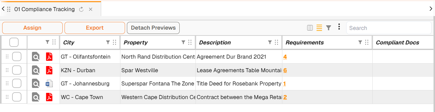 Dataviews can be configured to enable users to drill into, or access, underlying documents. For example, the above example includes a drill down to documents with specific compliance requierements. Clicking on the orange link (the number) enables the user to drill down to those documents.