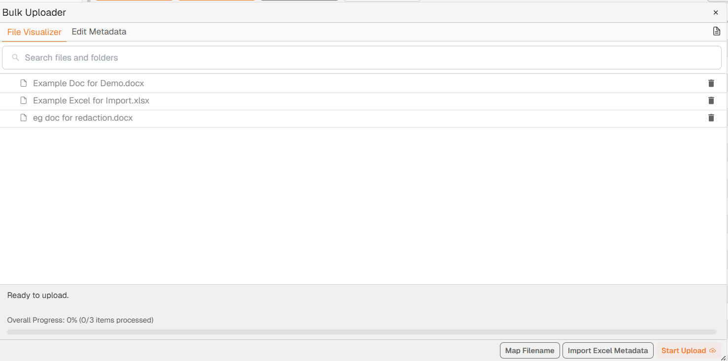 When a bulk upload option is chosen, once the relevant files or folder is selected, the user will be directed to the ‘Bulk Uploader’ dialog. If users choose to drag-and-drop file(s) from their device, once the files are dropped into the system, they will also be directed to the ‘Bulk Uploader’ dialog.