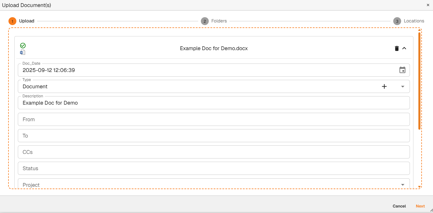 | 4 | Click ‘Next’ and allocate the document(s) to the relevant folder(s). |